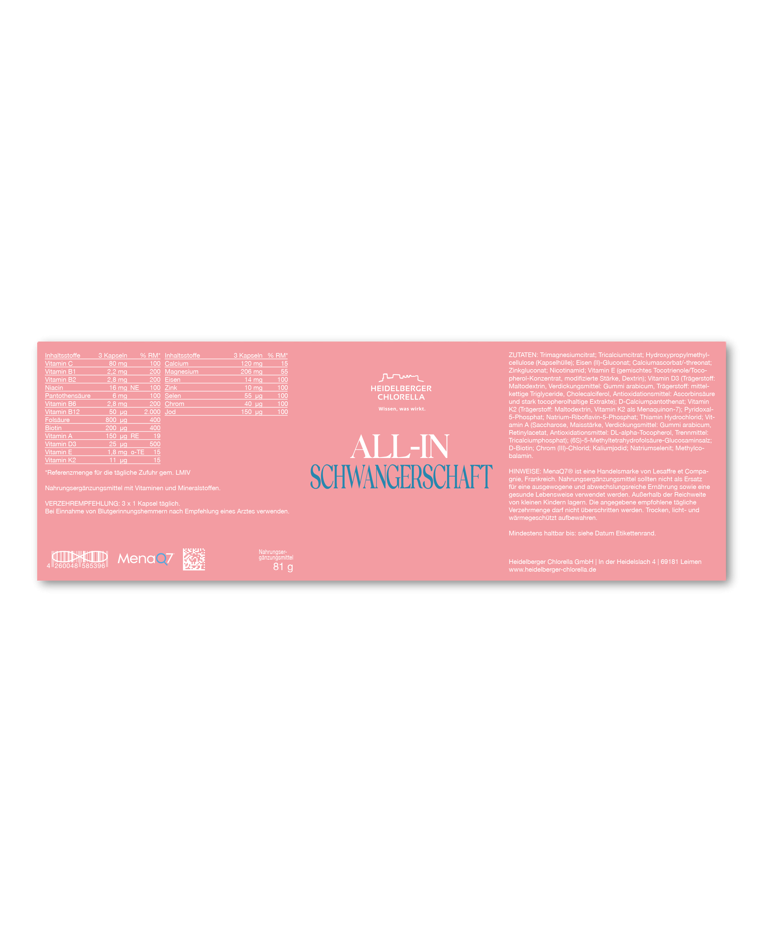 Trimagnesiumcitrat; Tricalciumcitrat; Hydroxypropylmethyl-cellulose (Kapselhülle); Eisen (II)-Gluconat; Calciumascorbat/-threonat; Zinkgluconat; Nicotinamid; Vitamin E (gemischtes Tocotrienole/Tocopherol-Konzentrat, modifizierte Stärke, Dextrin); Vitamin D3 (Trägerstoff:Maltodextrin, verdickungsmittel Gummi arabicum, Iragerston. mittelkettige Triglyceride, Cholecalciferol, Antioxidationsmittel: Ascorbinsäure und stark tocopherolhaltige Extrakte); D-Calciumpantothenat; Vitamin K2 (Trägerstoff: Maltodextrin, Vitamin K2 als Menaquinon-7); Pyridoxal-5-Phosphat; Natrium-Riboflavin-5-Phosphat; Thiamin Hydrochlorid; Vitamin A (Saccharose, Maisstärke, Verdickungsmittel: Gummi arabicum, Retinylacetat, Antioxidationsmittel: DL-alpha-Tocopherol, Trennmittel: Tricalciumphosphat); (6S)-5-Methyltetrahydrofolsäure-Glucosaminsalz; D-Biotin; Chrom (III)-Chlorid; Kaliumjodid; Natriumselenit; Methylcobalamin.