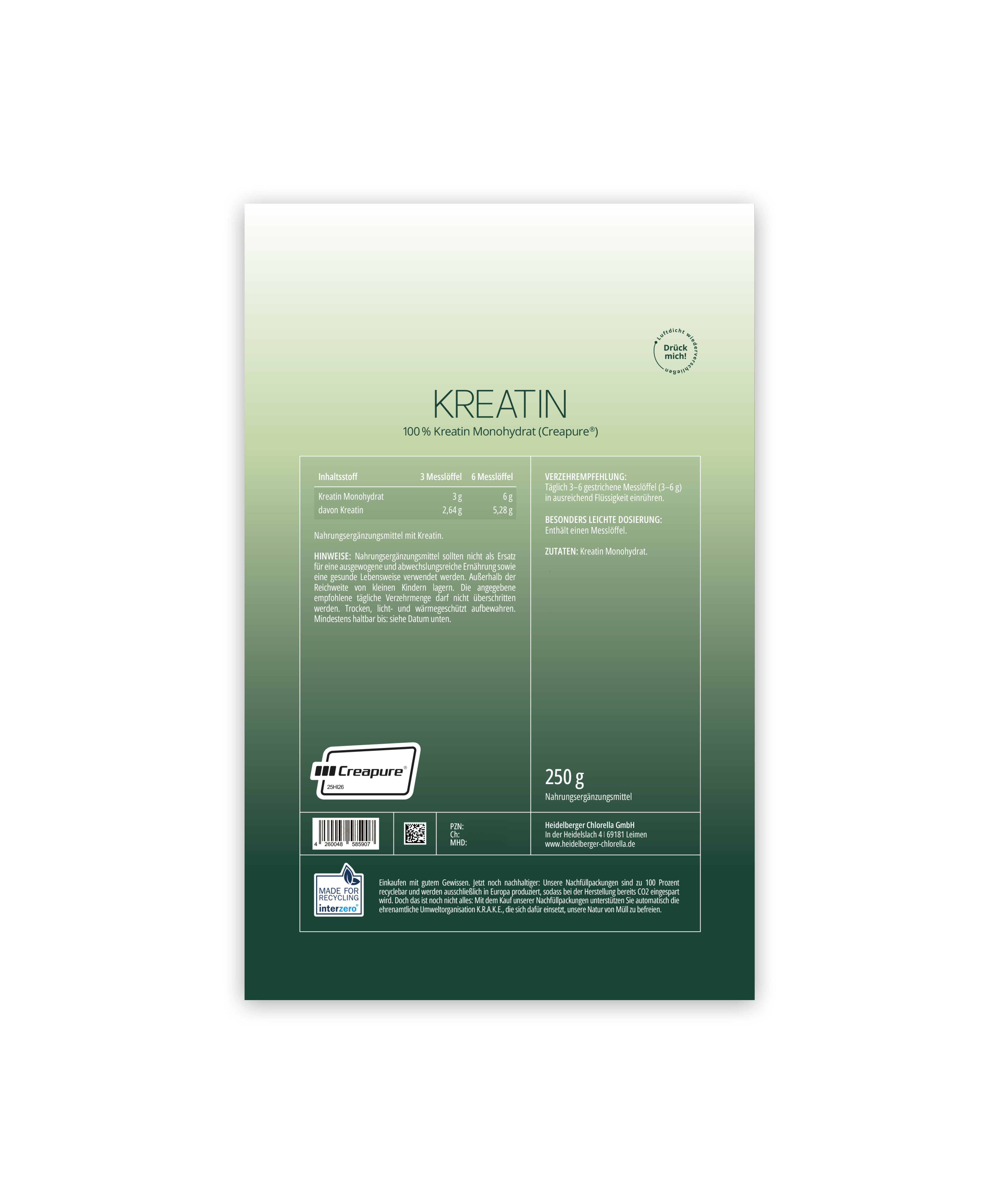 Unser Produkt enthält 100 % Creapure® Kreatin – einen hochwertigen und geprüften Markenrohstoff mit besonders hoher Reinheit. Kreatin ist eine körpereigene Substanz, die eine zentrale Rolle im Energiestoffwechsel der Muskeln spielt. Es erhöht die körperliche Leistung bei Schnellkrafttraining im Rahmen kurzzeitiger intensiver körperlicher Betätigung.