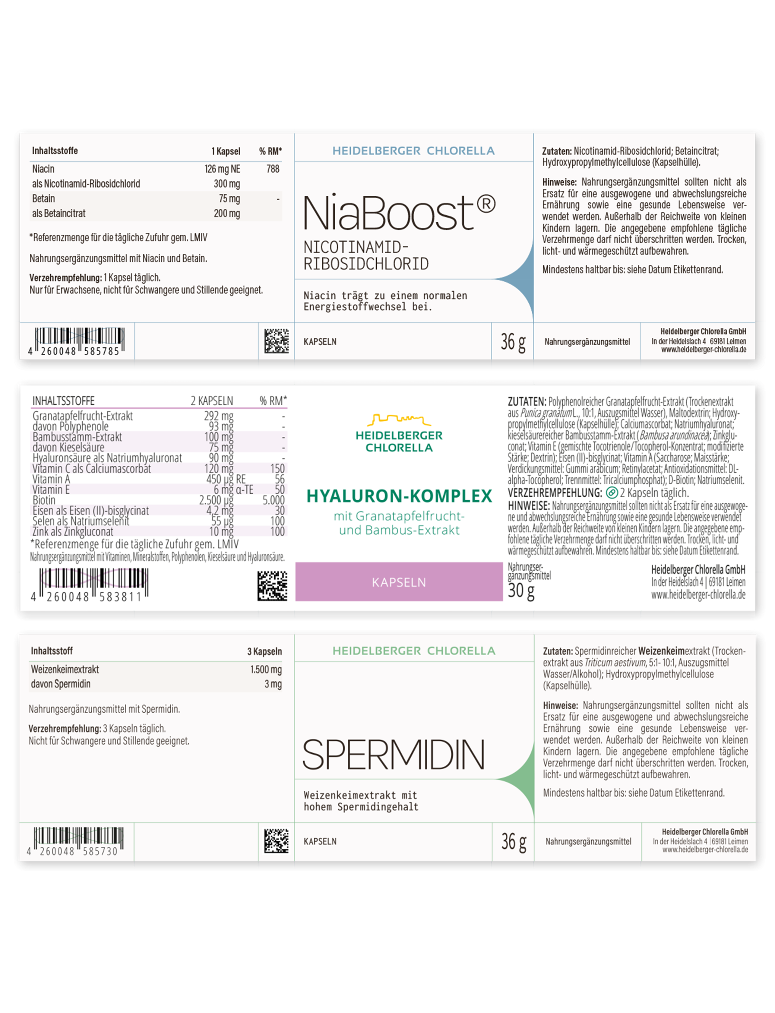 Hyaluron-Komplex: Polyphenolreicher Granatapfelfrucht-Extrakt (Trockenextakt aus Punica granatum L.; 10:1; Auszugsmittel Wasser); Trägerstoff: Maltodextrin; Hydroxypropylmethylcellulose (Kapselhülle); Calciumascorbat; Natriumhyaluronat; kieselsäurereicher Bambusextrakt (Bambusa arundinacea); Zinkgluconat; Vitamin E (gemischte Tocotrienole/Tocopherol-Konzentrat; modifizierte Stärke; Dextrin); Eisen (II)-bisglycinat; Vitamin A (Saccharose; Maisstärke; Verdickungsmittel: Gummi arabicum; Retinylacetat; Antioxidationsmittel: DL-alpha-Tocopherol; Trennmittel: Tricalciumphosphat); D-Biotin, Natriumselenit.