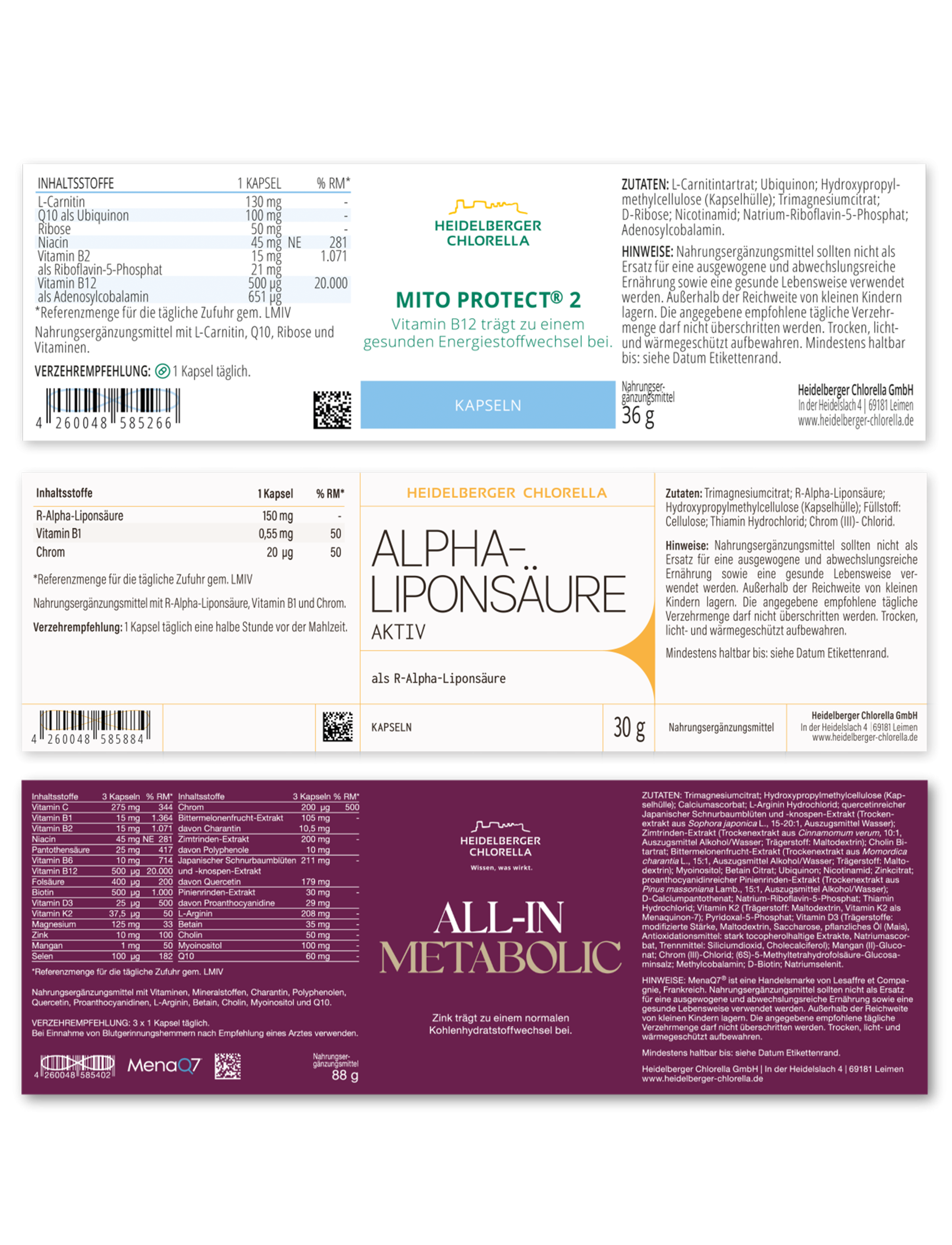 ALL-IN Metabolic: Trimagnesiumcitrat; Hydroxypropylmethylcellulose (Kapselhülle); Calciumascorbat; L-Arginin Hydrochlorid; quercetinreicher Japanischer Schnurbaumblüten und -knospen-Extrakt (Trockenextrakt aus Sophora japonica L., 15-20:1, Auszugsmittel Wasser); Zimtrinden-Extrakt (Trockenextrakt aus Cinnamomum verum, 10:1, Auszugsmittel Alkohol/Wasser; Trägerstoff: Maltodextrin); Cholin Bitartrat; Bittermelonenfrucht-Extrakt (Trockenextrakt aus Momordica charantia L., 15:1, Auszugsmittel Alkohol/Wasser; Trägerstoff: Maltodextrin); Myoinositol; Betain Citrat; Ubiquinon; Nicotinamid; Zinkcitrat; proanthocyanidinreicher Pinienrinden-Extrakt (Trockenextrakt aus Pinus massoniana Lamb., 15:1, Auszugsmittel Alkohol/Wasser); D-Calciumpantothenat; Natrium-Riboflavin-5-Phosphat; Thiamin Hydrochlorid; Vitamin K2 (Trägerstoff: Maltodextrin, Vitamin K2 als Menaquinon-7); Pyridoxal-5-Phosphat; Vitamin D3 (Trägerstoffe: modifizierte Stärke, Maltodextrin, Saccharose, pflanzliches Öl (Mais), Antioxidationsmittel: stark tocopherolhaltige Extrakte, Natriumascor-bat, Trennmittel: Siliciumdioxid, Cholecalciferol); Mangan (II)-Gluconat; Chrom (III)- Chlorid; (6S)-5-Methyltetrahydrofolsäure-Glucosaminsalz; Methylcobalamin; D-Biotin; Natriumselenit.