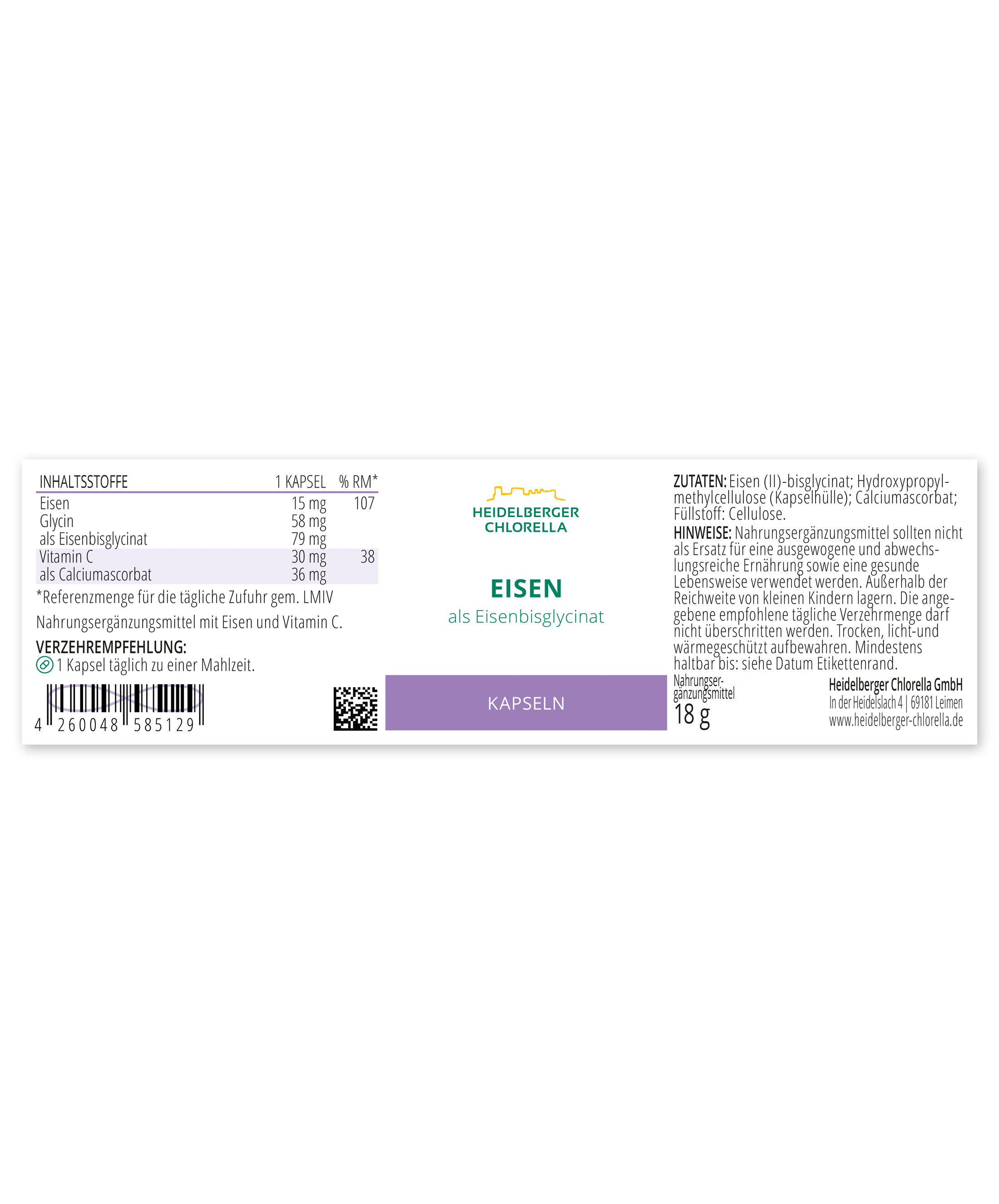 In unseren Eisenkapseln liegt das Spurenelement als organische Verbindung mit der Aminosäure Glycin vor. Darüber hinaus haben wir das Produkt sinnvoll mit Vitamin C ergänzt, das die Aufnahme von Eisen erhöht.