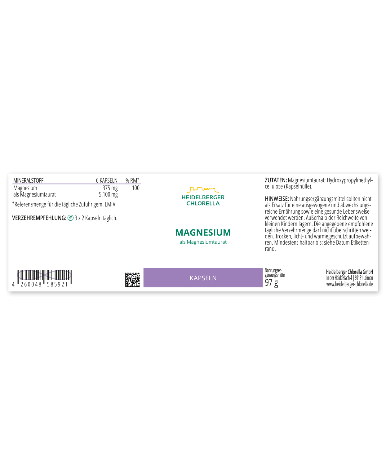 In unseren Magnesiumtaurat Kapseln liegt der Mineralstoff Magnesium an die aminosäuren-ähnlichen Substanz Taurin gebunden vor. Diese ist ein wichtiger Baustein der Muskulatur und des Herzmuskels. Darüber hinaus ist Taurin am Aufbau von Gallensäuren beteiligt und wird vom menschlichen Körper beim Binden von Fremdstoffen eingesetzt.