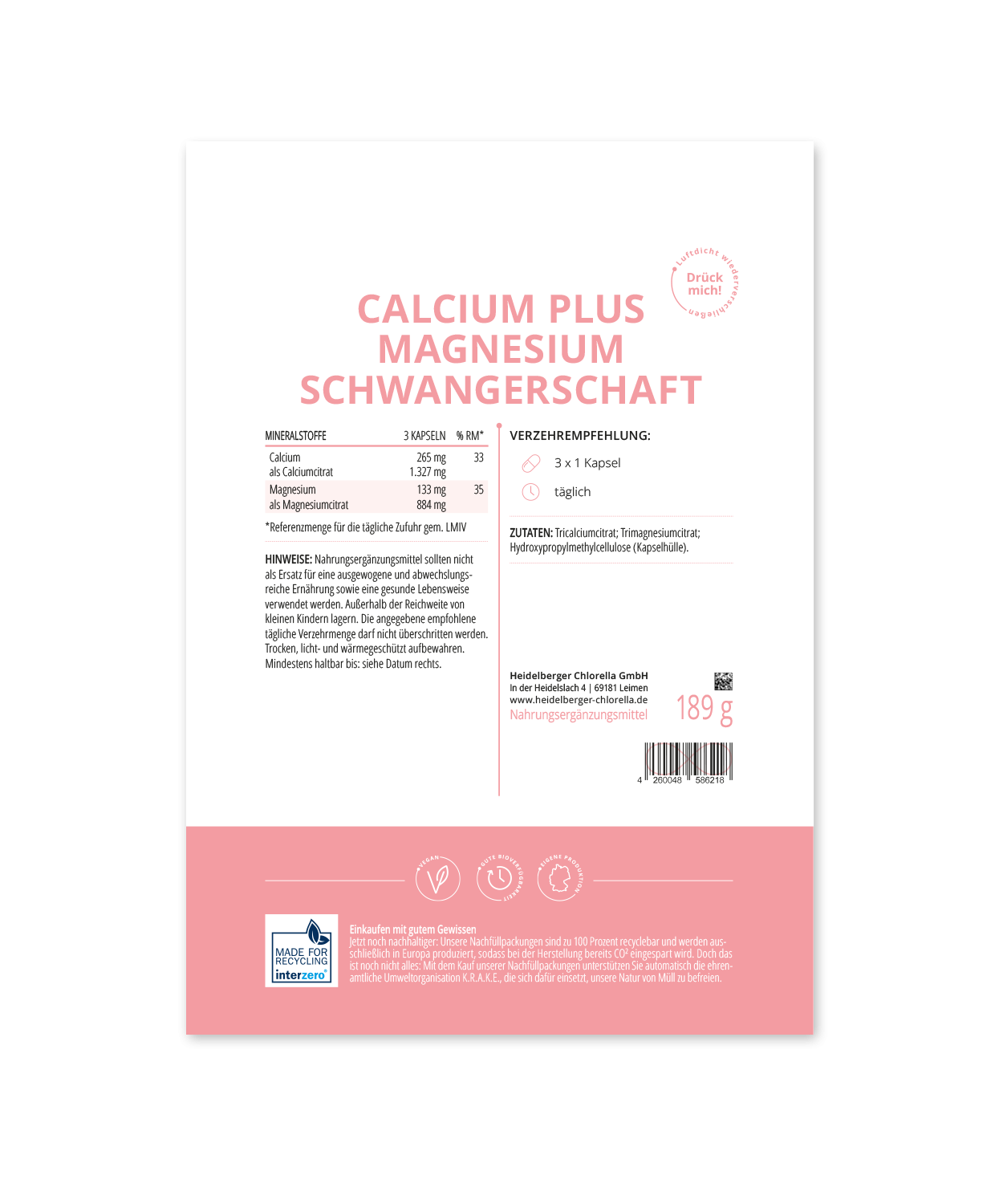 Die Schwangerschaft und insbesondere die Geburt stellen für die Frau eine große Herausforderung dar. Umso wichtiger ist es den Körper in dieser Zeit bestmöglich auszustatten. Unser Kombinationsprodukt aus Calcium und Magnesium ist dabei genau auf die Bedürfnisse der werdenden Mutter und ihres Schützlings abgestimmt. Die beiden Mineralstoffe liegen als gut bioverfügbare organische Verbindungen im natürlichen Verhältnis von 2:1 vor.